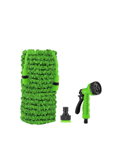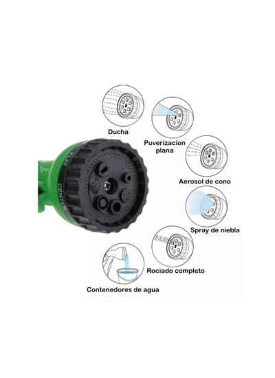 Manguera expandible con boquilla regadera para regar jardín y realizar lavados multiples color verde.