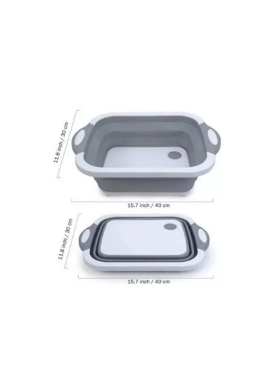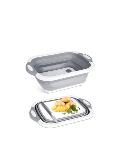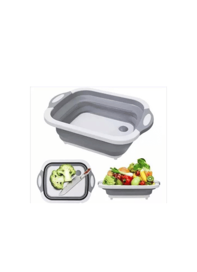 Recipiente dos en uno plegable con sistema de drenaje, ideal para lavar alimentos y funciona como tabal de picar. Fácil de limpiar. Ayuda a ahorrar espacio.